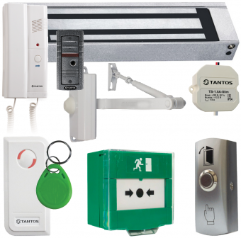 Комплект Tantos TS-ML300, аудиодомофон - Электромагнитный замок, монтажный уголок, доводчик, аварийная кнопка, кнопка выхода, блок питания, контроллер, считыватель, ключ.