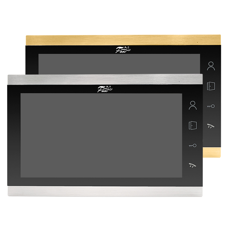 Доступные цвета: серебро/золото. Цветной монитор видеодомофона без трубки с большим 10" экраном, подключение аналоговых или HD видеокамер с разрешением до 1080p, запись по детектору движения по всем каналам, ширина корпуса 284 мм.