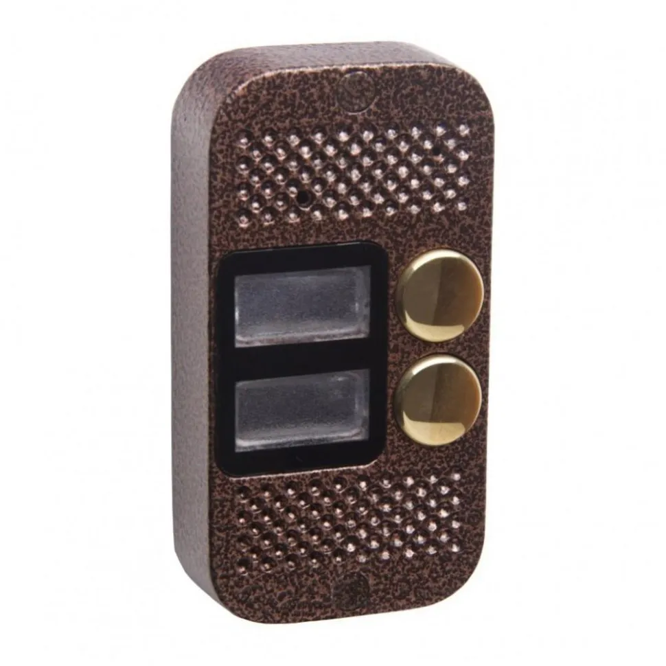 Доступные цвета: медь. Вызывная панель для видеодомофона Major Classic 800/2 - на 2 абонента, разрешение 800 ТВЛ, угол обзора 74° по горизонтали, ИК подсветка, рабочая температура: -30..+50С, размеры: 113(В)х61(Д)х22(Ш) мм.