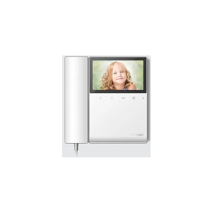 Доступные цвета: белый. Цветной экран 4,3”, TFT, PAL, трубка, сенсорное управление, просмотр фото с вызывной панели, беззвучный режим, интерком, подключение до 2 вызывных панелей, 2 дополнительных трубкиок, до 2-х мониторов в системе, совместимость с подъездными домофонами