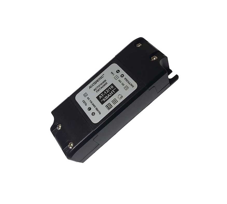 Стабилизированный блок питания AccordTec AT-12/10 "КВАНТ" с возможностью регулировки выходного напряжения в пределах 11,9 ... 14,7В. Источник питания предназначен для запитки устройств, электрорадиоаппаратуры и других приборов выпрямленным стабилизированным напряжением 12В и допустимой токовой нагрузкой до 1А (с кратковременным повышением до 1,3А). Этот блок подойдет для любой техники с заявленными питающими характеристиками.