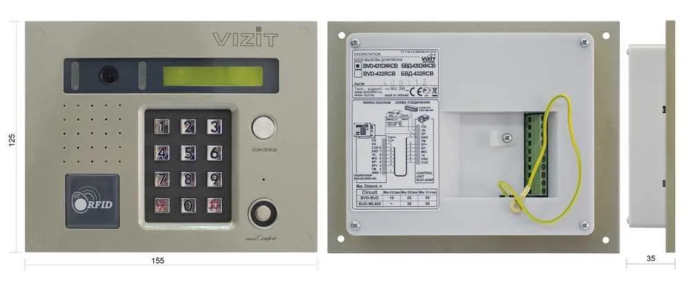 Блок вызова БВД-431 DXKCB (производитель "Vizit") с цветной видеокамерой обеспечивает прямую абонентскую связь и открытие дверей специальными ключами ("Vizit- TM" и "Vizit-RF 2"). Оснащен громкой связью, опцией "вызов консьержа" и подсветкой.