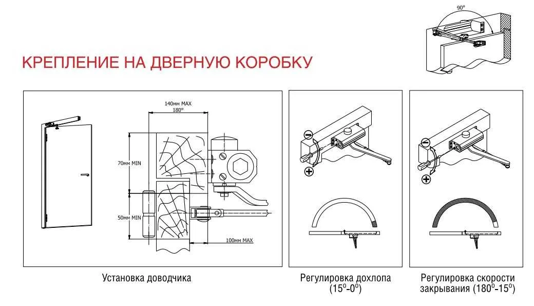 Ресурс данного устройства рассчитан на стандартную проходимость. Съемное колено доводчика позволяет произвести его установку отдельно от монтажа корпуса доводчика.