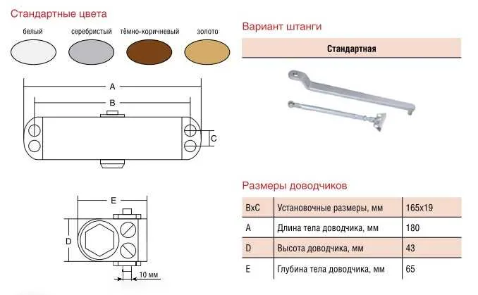 Доводчик имеет антикоррозийное покрытие и представлен в четырёх цветовых решения: