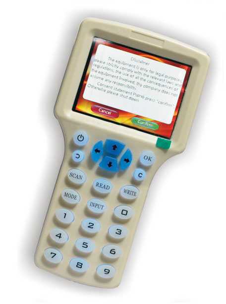 Это достаточно "универсальный" дубликатор RFID PROGRAMMER. Записывает и копирует бесконтактные домофонные ключи, карты доступа. Устройство прекрасно работает с метками, работающими на частотах: 125KHz, 250kHz, 500KHz, 375KHz, 750kHz, 875KHz, 1000KHZ, 13.56MHz. Есть порт USB. Питание дубликатора осуществляется четырьмя элементами питания AAA