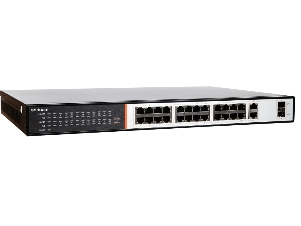 Коммутатор SSDCAM POE-624P - 24 порта 10/100 Мбит/сек RJ-45 с поддержкой Auto-MDIX, PОE, + 2 порта 100/1000Mbps RJ-45 Uplink + 2 порта SFP, возможность установки в 19U стойку, на порт 48V Max.,15.4 Вт (IEEE 802.3af), общая мощность 400W, AC-220V (встроенный блок питания, 285x180x45 мм, 4000 гр. Усиление передачи данных до 250 метров, путем снижения пропускной способности до 10Мбит/сек на каждый РОЕ порт, кроме портов Uplink.
