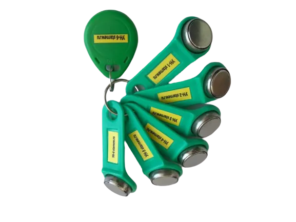 В комплекте "Вездеход УК-6v3" пять контактных ключей зеленого цвета и один бесконтактный. Работают они по принципу критического кода. Ключ при соприкосновении со считывателем домофона вводит его в состоянии ошибки, и домофон срабатывает на открытие. Эта функция предусмотрена у каждого отечественного производителя домофонов по умолчанию. Если же механизм аварийного открытия заблокирован, то схема не работает и необходимо подбирать другими способами.