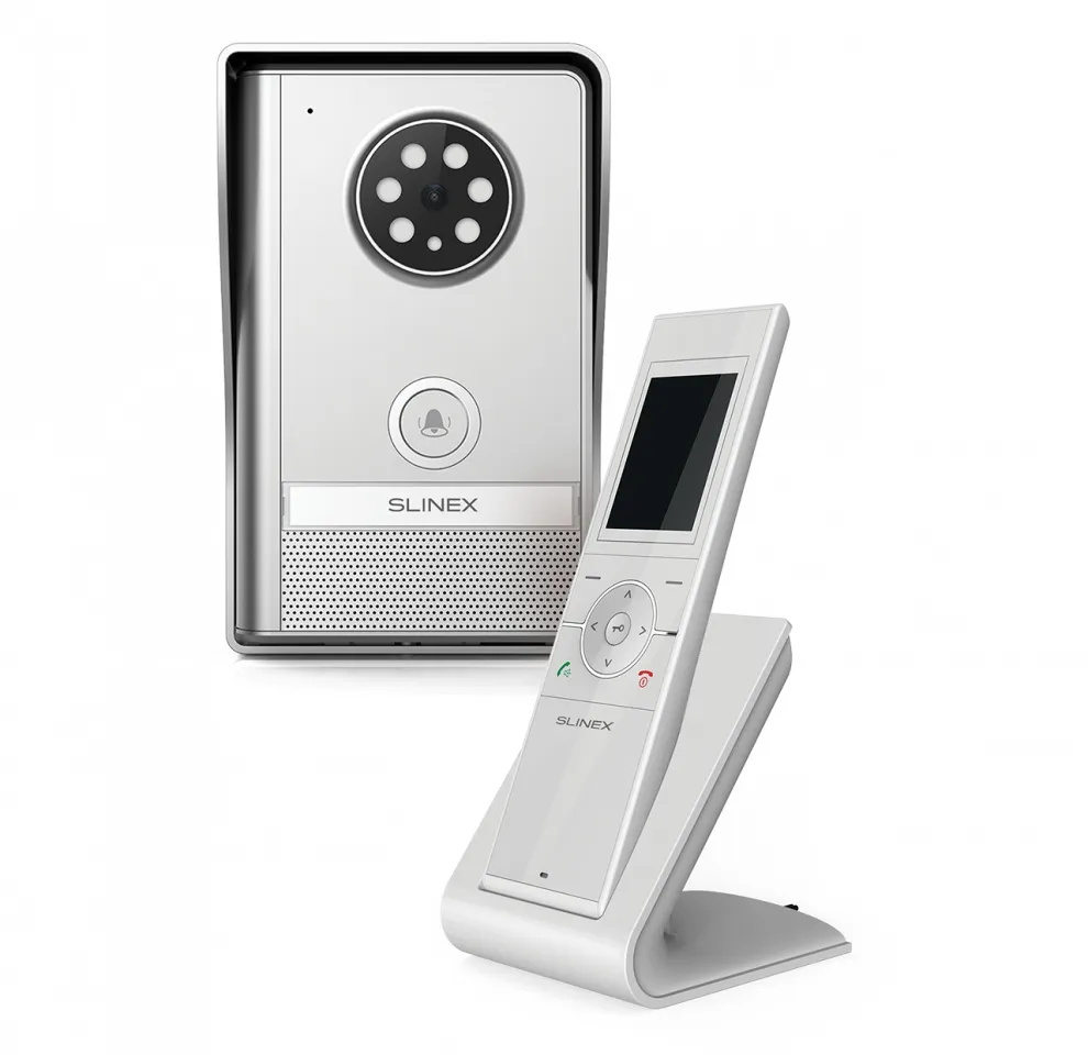 Доступные цвета: белый. Беспроводной комплект видеодомофона (компактная видеотрубка и вызывная панель), внутренняя память до 50 кадров, класс защищенности - IP55, угол обзора камеры - 120º.