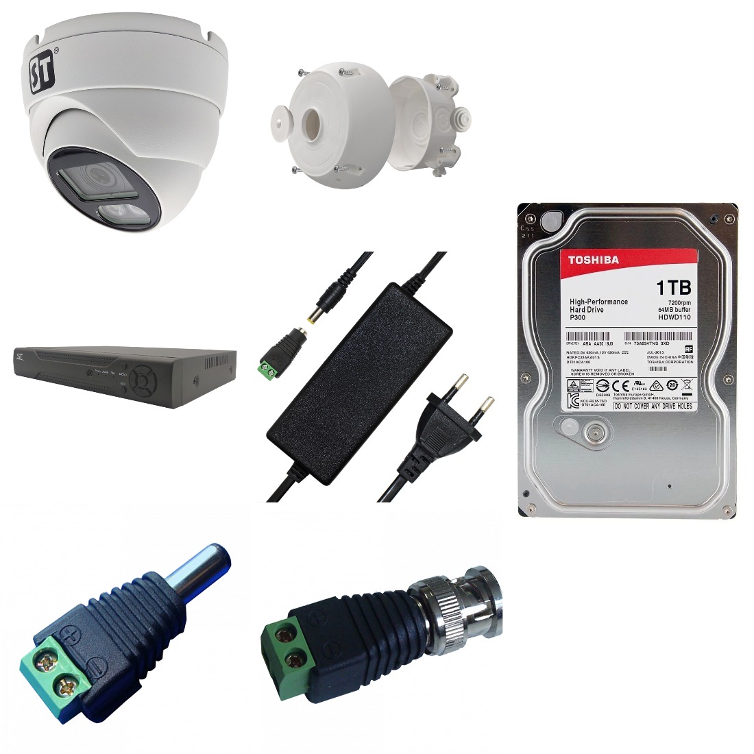 Полноценный комплект видеонаблюдения состоящий из видеорегистратора, видеокамеры, блока питания, разъёма, монтажной коробки и жёсткого диска.