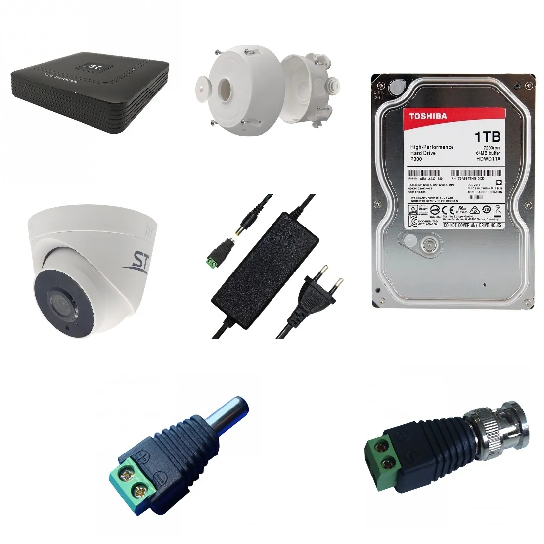 Цветная 4-in-1 камера,Разрешение:2,1MP (1920х1080)/960H,с ИК подсветкой, Купольная, Сенсор: 1/3" Progressive Scan CMOS, Фокусное расстояние: 3,6mm (соответствует 90° по горизонтали), Дальность ИК подсветки: до 25 м, 3 IR LED, Светочувствительность (мин. освещение): 0,1 Lux (цвет) / 0,01 Lux (ч/б) /0 Lux (с IR), Электронный затвор: 1/50-1/10000 сек, Напряжение питания: 12 В, OSD-меню: есть, Функции улучшения изображения: BLC,DWDR,AWB,MWB,2DNR,AGC, ИК-фильтр: Механический, 25 к/с, Регулировка кронштейна: 3D-Ось, Рабочая температура: 0°… +60°С, Степень защищенности/вандалостойкость: IP54 / -, Материал корпуса: ПЛАСТИК. - TS-3A (Блок питания) -1400р St-BNC-P: 4 шт - 200р