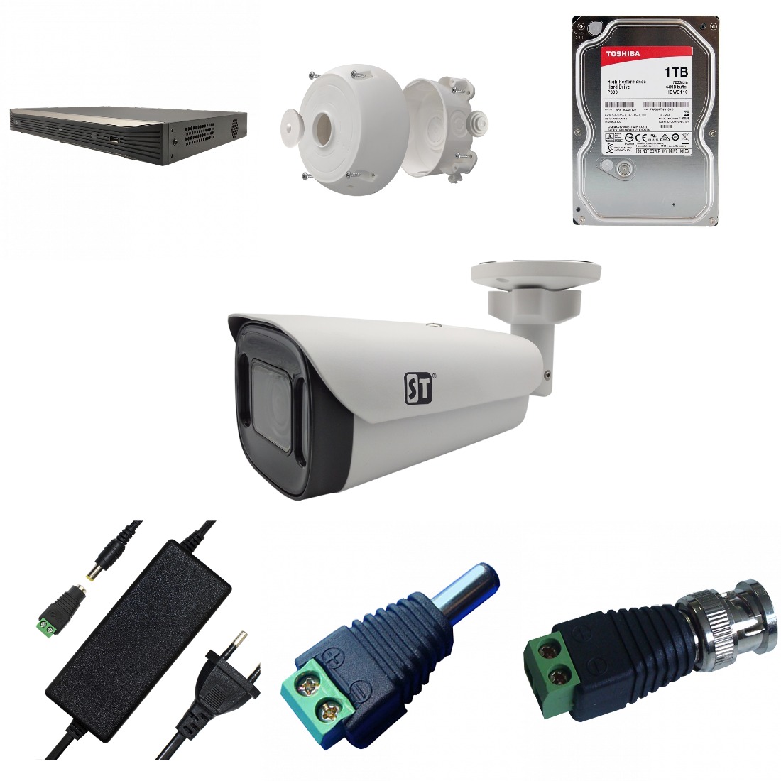 Полноценный комплект видеонаблюдения состоящий из видеорегистратора, видеокамеры, блока питания, разъёма, монтажной коробки и жёсткого диска.