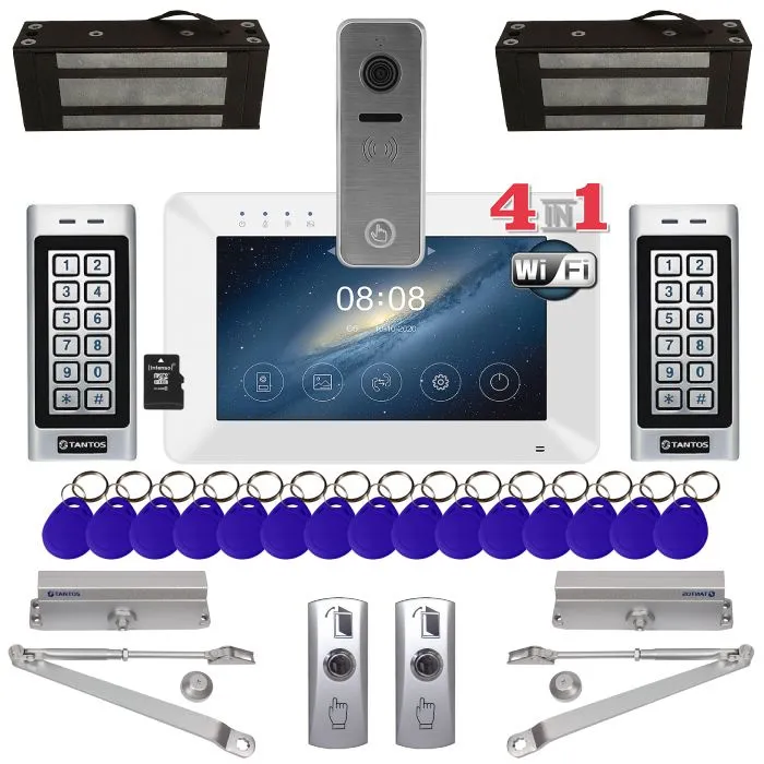 Этот комплект предназначен для двух дверей и обеспечивает полный контроль благодаря подключению к смартфону, поддержке кодовых панелей и видеофиксации.Набор включает в себя HD-монитор с диагональю экрана 7 дюймов, поддерживающий фото, видео и перенаправление звонков на мобильное устройство, мощные электромагнитные замки способны надежно удерживать дверные конструкции весом до 300 кг. Это универсальное решение идеально подойдет для жилого помещения, коммерческого здания, складского комплекса или иного объекта, нуждающегося в эффективном контроле доступа.