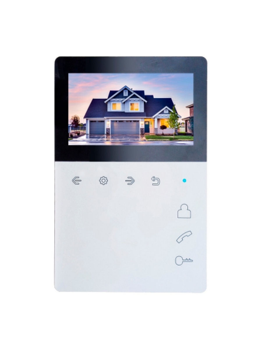 Цветной экран 4,3”, TFT, 480x272, СVBS (PAL/NTSC), HandsFree, сенсорное управление, беззвучный режим, интерком, совместимость с подъездными видеодомофонами, экономное энергопотребление, запись видео, внутренняя память, MicroSD до 32 ГБ