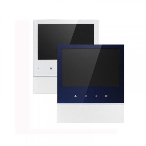 Доступные цвета: белый, синий. Цветной экран 7”, TFT, PAL, Hands Free, сенсорное управление, просмотр фото с вызывной панели, беззвучный режим, интерком, подключение до 2 камер, 2 вызывных панелей, до 2-х мониторов в системе