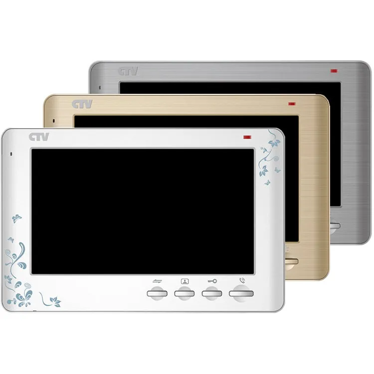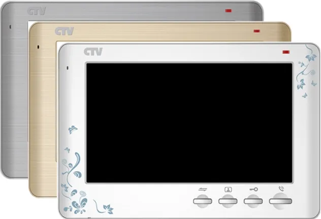 Монитор CTV-M1704SE видеодомофона - со сменными передними панелями (серебристый металлик, "шампань", "белый декор"), с кнопочным управлением, встроенный автоответчик, встроенный источник питания.