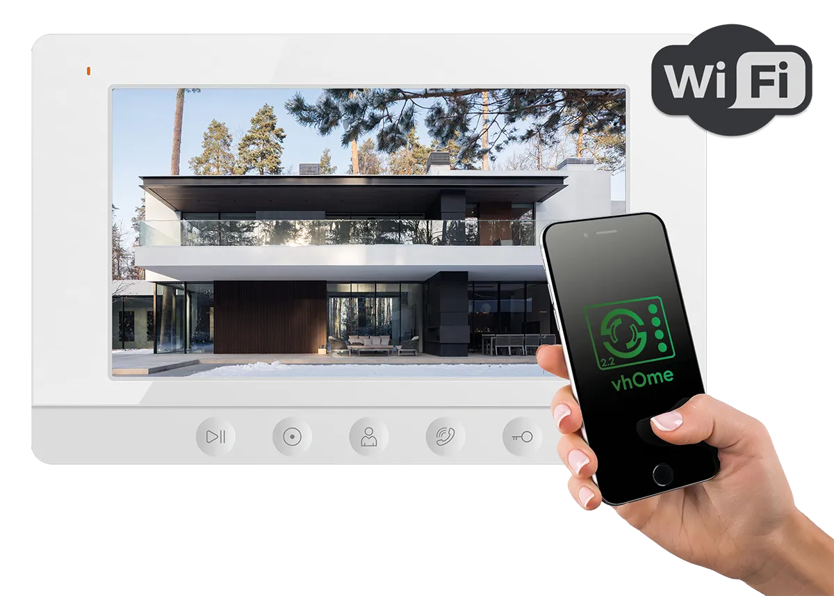 Доступные цвета: белый. Монитор видеодомофона с 7"дисплеем, с разрешением 800х480 точек, сенсорными кнопками и форматом видеосигнала AHD. Поддержка удаленного доступа через мобильное приложение vhOme 2.2