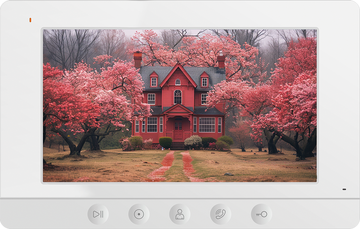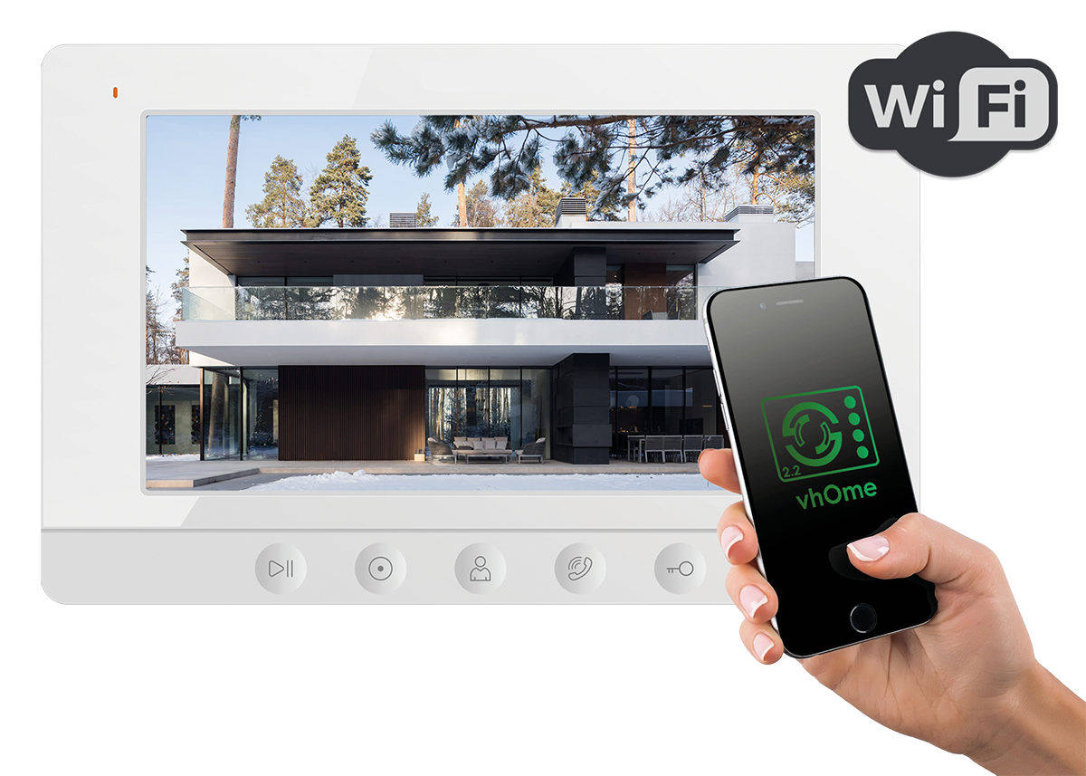 Доступные цвета: белый. Монитор видеодомофона с 7"дисплеем, с разрешением 800х480 точек, сенсорными кнопками и форматом видеосигнала AHD. Поддержка удаленного доступа через мобильное приложение vhOme 2.2