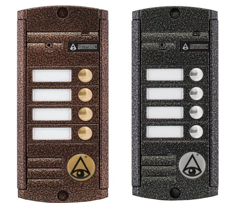 Доступные цвета: антик, медь. Видеокамера 1/3", 1000 ТВЛ, встроенная ИК-подсветка до 0,6 м, 75° угол обзора по горизонтали, накладная установка, антивандальное исполнение, 4-проводное соединение, 4 абонентов