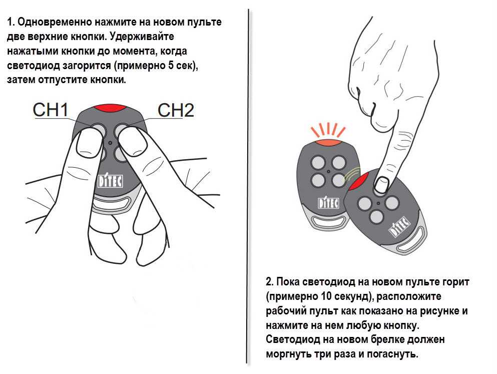 1. Одновременно нажмите кнопки СН1 и СН2 на новом передатчике, пока не загорится красный светодиод, затем отпустите обе кнопки.