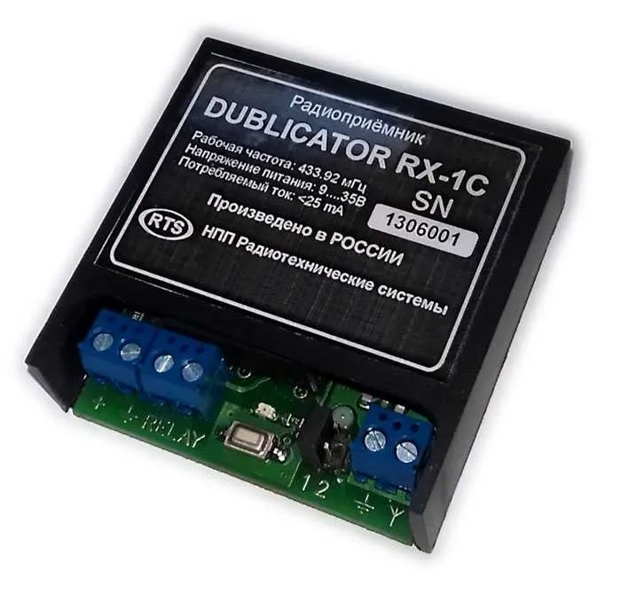 Представленный Вам радиоприемник RX-1C может устанавливаться в автоматику ворот, шлагбаумов и других радиоуправляемых устройств для дистанционного управления ими. Вся прелесть RX-1C в том, что он может работать и как дополнительный приемник, поддерживающий широко распространенные и недорогие пульты такие как SK-4, Came TOP-432NA, Came TOP-434NA и их аналоги. Будет прекрасным решением в случае выхода из строя Вашего дорогого оригинального пульта, и необходимости срочной его замены; либо при желании иметь дублирующее управление воротами или шлагбаумом. Подключается RX-1C к любым блокам управления автоматикой ворот, шлагбаумов и т.д., которые имеют вход для управления с кнопки.