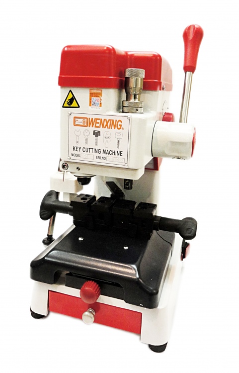 Вертикально-фрезерный станок для изготовления ключей типа: APECS, ABUS, AGB, ISEO, KALE, TESA, 3M, MSM,и т.д, а также автомобильных ключей. Имеет два сбалансированных зажима для ключей и ключевых заготовок. Двигатель (4500-10500 об/мин), питание 220в.,50гц. Рабочие режущие инструменты - сменные торцевые фрезы изготовленные из быстрорежущей инструментальной стали. Реализована возможность точной регулировки копира при помощи микрометрического винта. Имеется подсветка рабочих зон фрез и копиров. Два сбалансированных зажима под ключ и заготовку имеют сдвижные губки. Относительно фрезы и копира тиски имеют фиксацию в рабочем положении. Подача каретки осуществляется вручную в 3-х плоскостях по шариковым направляющим. Сменный копир и фреза устанавливаются в патрон станка и фиксируются винтовым зажимом.