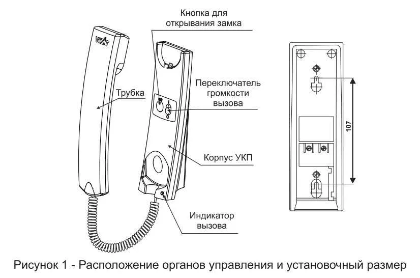 Устройство имеет ступенчатую регулировку громкости и кнопку дистанционного открывания входной двери, который расположены на подставке. Световую индикацию поступившего вызова обеспечивает светодиод, вмонтированный в нижний правый угол подставки прибора.