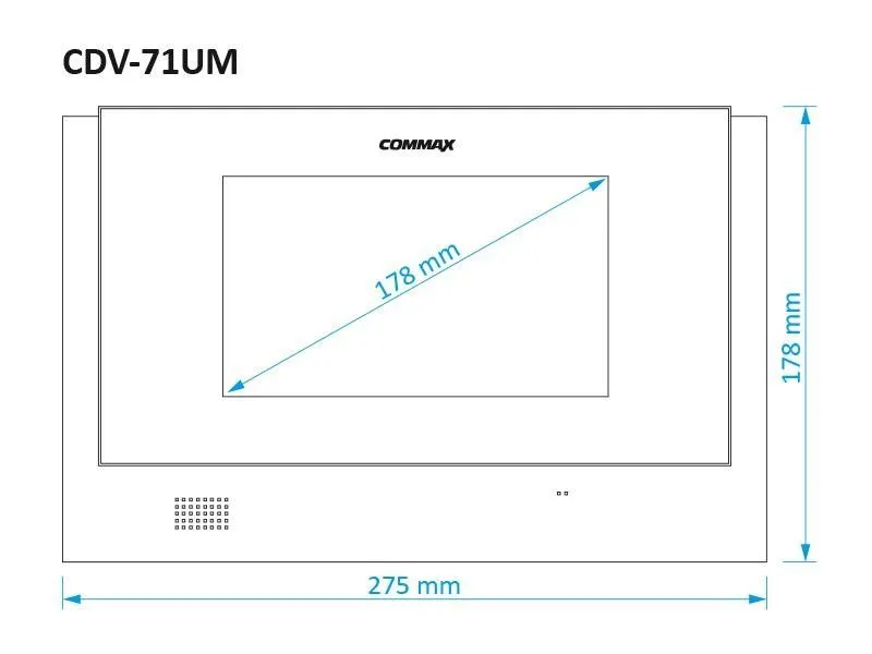 Commax CDV-71UM- Экран сенсорный с выходом на 4 камеры,TFT матрица,LED-подсветкой,диагональ 7 дюймов. При звонке на экране показывает четкое насыщенное изображение посетителя. так же делается делается фото или видео фиксация посетителя, время и дата посещения,но видео возможно сохранить только на SD карту если карты нет, то видео не записывается. Фото и видео фиксация может так же производится от датчика движения. Датчик движения имеет 3 уровня чувствительности . Фото сохраняется в формате JPG. Видеозапись в формате MP4.Открывание замка происходит при нажатии кнопки на мониторе.При ручном включении монитор работает 30 сек.,а если поступил звонок от вызывной панели то 60 сек.