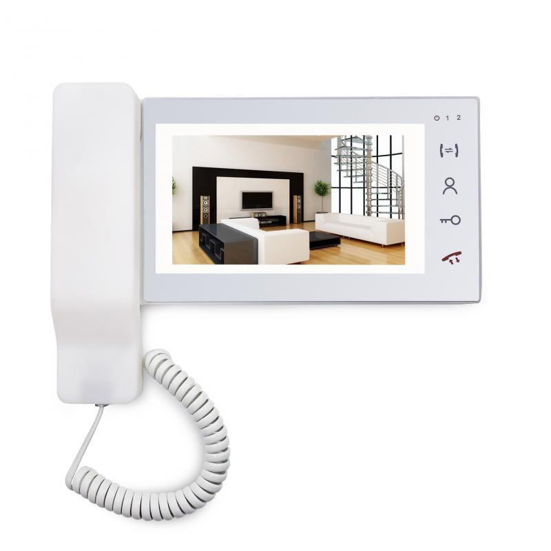 Цветной 7" видеодомофон с трубкой, с экраном HD (1024х600) с поддержкой видеоформата PAL. Поддерживает разговор в режиме hands-free или через трубку. Поддержка функции записи видео по детекции движения на карту SD до 32Гб. Максимальное подключение: 2 вызывные панели + 2 камеры + 5 дополнительных мониторов J2000 (совместимы с мониторами с адресным интеркомом). Видеовыход на внешний экран ЖК или видеорегистратор. Возможность подключения к подъездным домофонам через блок сопряжения J2000 и его аналоги. Механические кнопки. Питание монитора 220В (встроенный блок питания) или от 12V. Накладное крепление. Габариты: 243х121х21