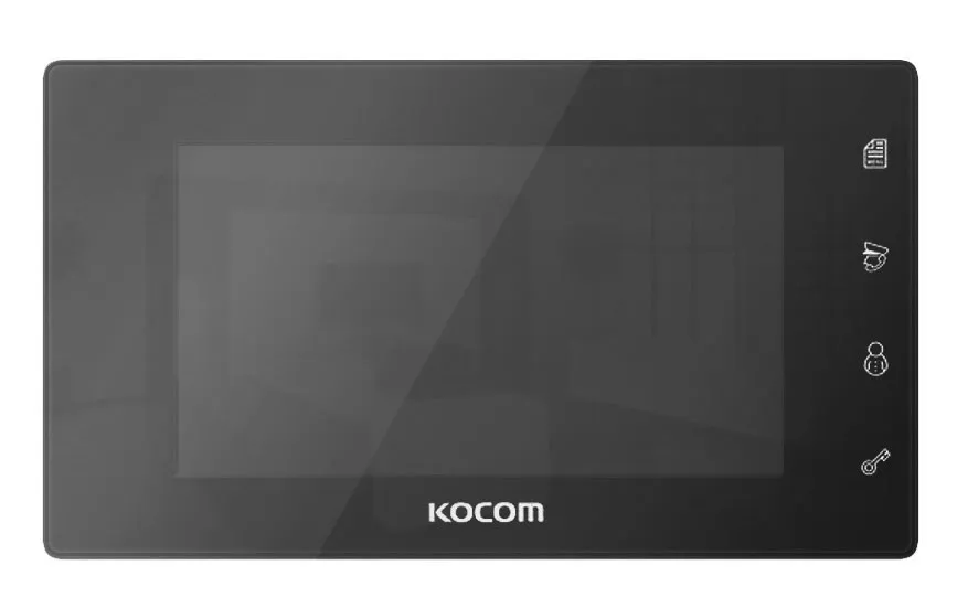 Доступные цвета: черный, белый. Видеодомофон Kocom KCV-504. Размер экрана 7" TFT, PAL/NTSC, hands-free, с сенсорными кнопками, металлический корпус, с возможностью дистанционного управления замком.