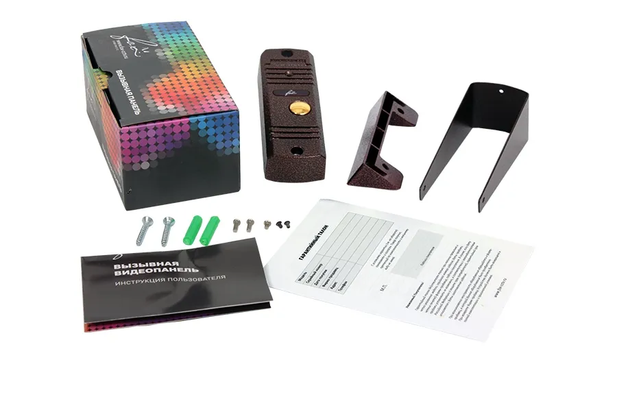Доступные цвета: медь. Выполнена в антивандальном металлическом корпусе. Крепление накладное, в комплекте предусмотрены Козырек и Уголок. Камера в панели с широким углом обзора 75°, поддерживает разрешение 700 Твл. Встроенная ИК-подсветка с ИК фильтром и дальностью до 5м, обеспечивает хорошую видимость объекта в темное время суток.