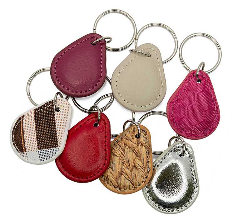Брелок Цветная кожа RFID (T5577) имеет вид кожаного лоскута, перекинутого через кольцо держания и скрепленного металлической кнопкой. Цвет заготовки разный – от пастельных оттенков до ярких красных, синих, зеленых. Выбор большой. Края брелка качественно обрезаны.