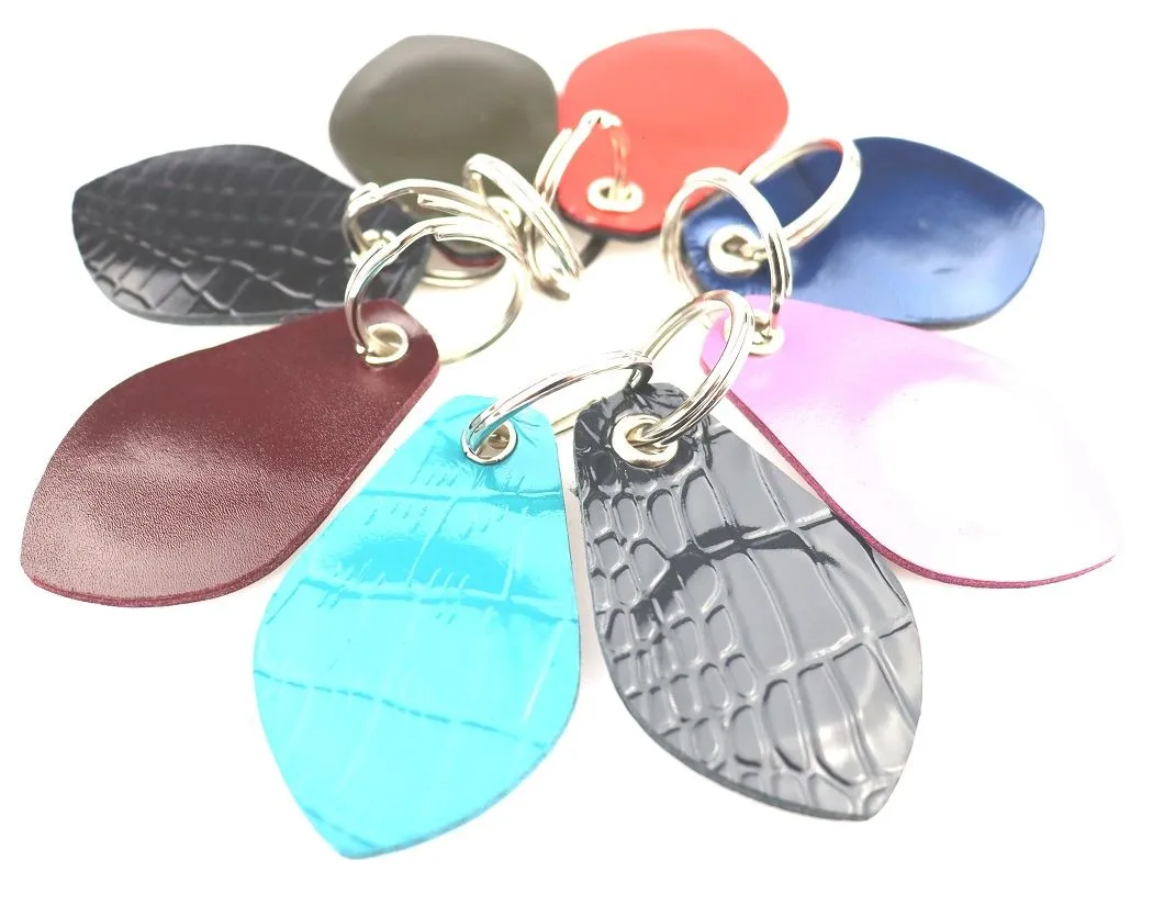 Брелок Цветная кожа RFID (T5577) имеет вид кожаного лоскута, перекинутого через кольцо держания и скрепленного металлической кнопкой. Цвет заготовки разный – от пастельных оттенков до ярких красных, синих, зеленых. Выбор большой. Края брелка качественно обрезаны.